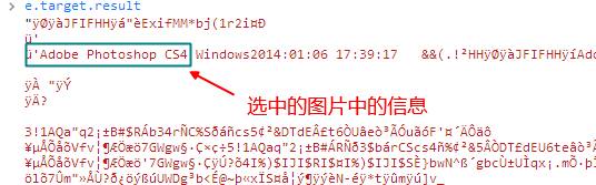 而 readAsBinaryString,则将 ArrayBuffer 转化为原生的 String 类型,为此能够操纵文件的具体内容。而不再只是孤零零地盯着 ArrayBuffer 什么也干不了。为此你可以用来做文件的安全性检测,检查文件类型时候正确等等等等,比如说我可以查找一个图片的信息,如果有 PS 处理过的痕迹,可以很清晰地看到想关信息: