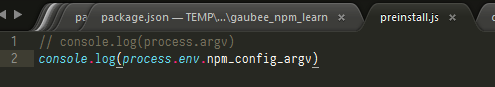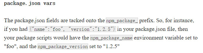 在ENVIRONMENT环节中有讲到 package.json 文件在 npm 命令运行的时候,相关的配置以及参数会被拍扁,变成环境变量。