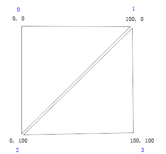 如图,首先把 vertices 的数据中的顶点 4 个坐标点出,每两个数据为一组数据点 x,y,这里一共四个点。 然后这四个点如何连成三角形?上面提到点的顺序必须是 0,1,2 然后 1,2,3。如果还有更多,那就是 2,3,4,如此下去,就形成三角网状结构。而 indices 参数就是用来指出这四个点的顺序。默认是[0,1,3,2],那么就得到一下顺序: