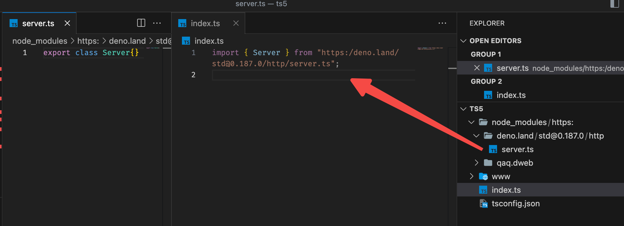 然后同样的代码,在 nodejs 项目中,不启用 deno,只添加一个 tsconfig.json,使用 ts5+ 来实现 .ts
